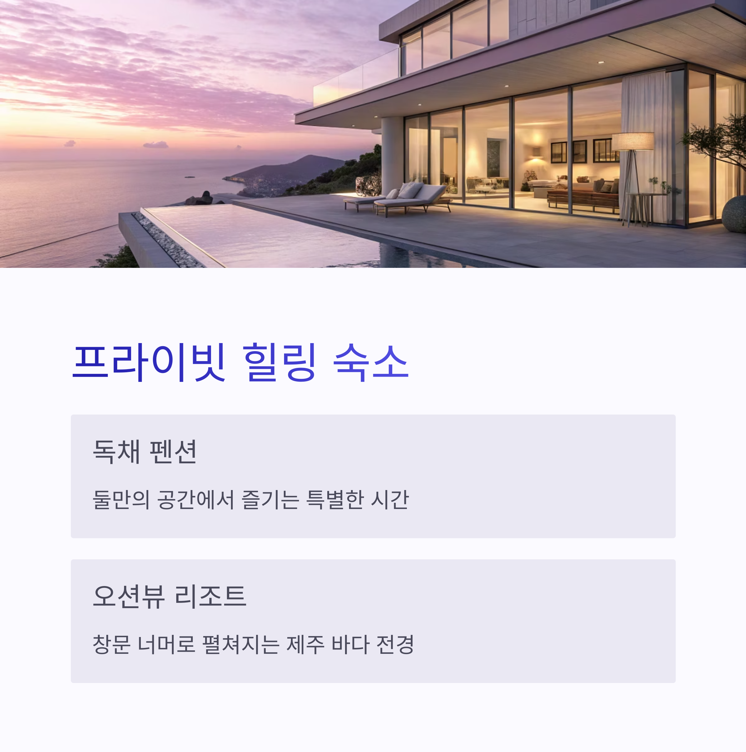 | 협재 해변, 성산일출봉 등 추천 | 감성 카페, 바닷가 산책로 등 | 독채 펜션, 바다 뷰 리조트 등 |