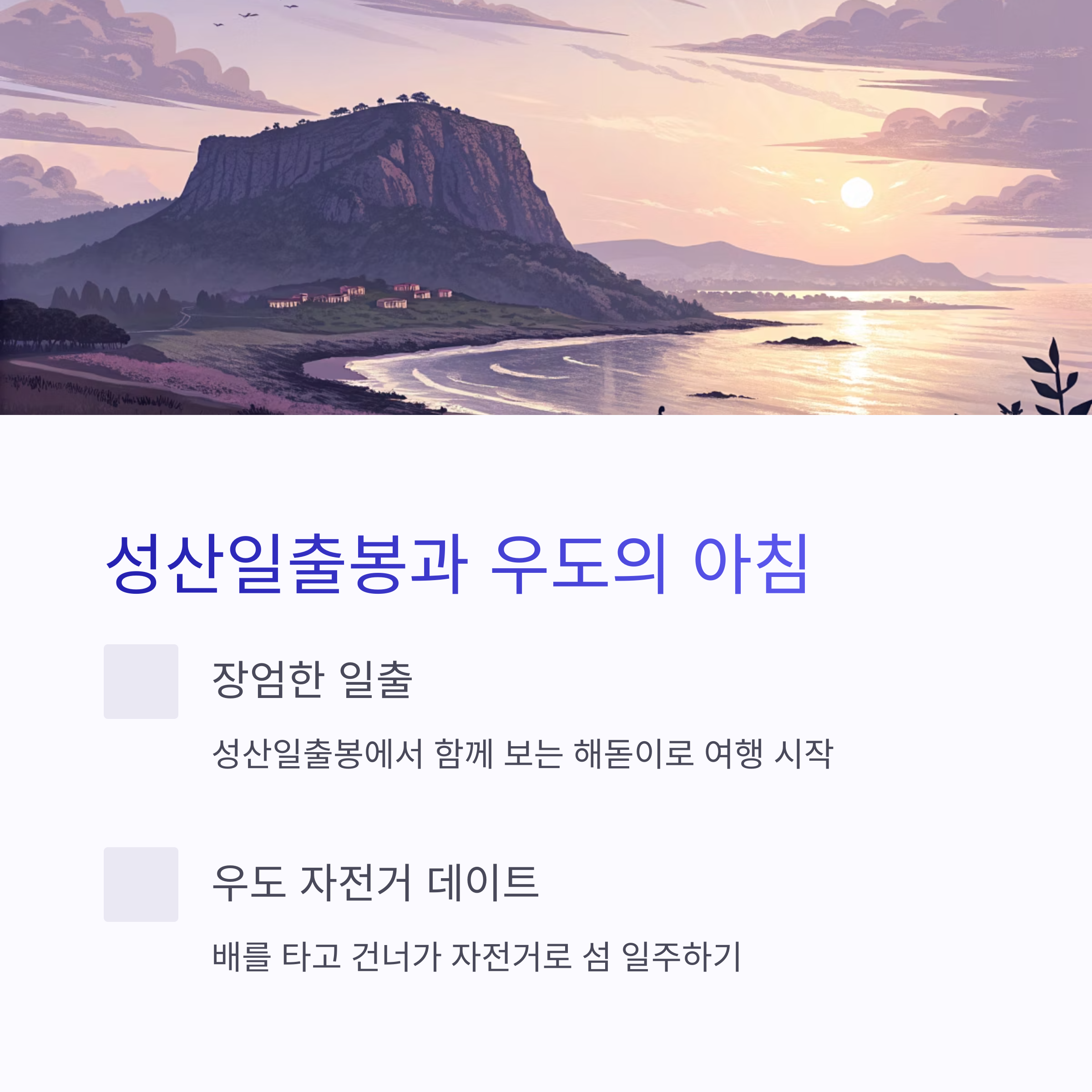 | 커플 여행 코스 | 감성 카페, 해변, 일출, 프라이빗 숙소 포함 |