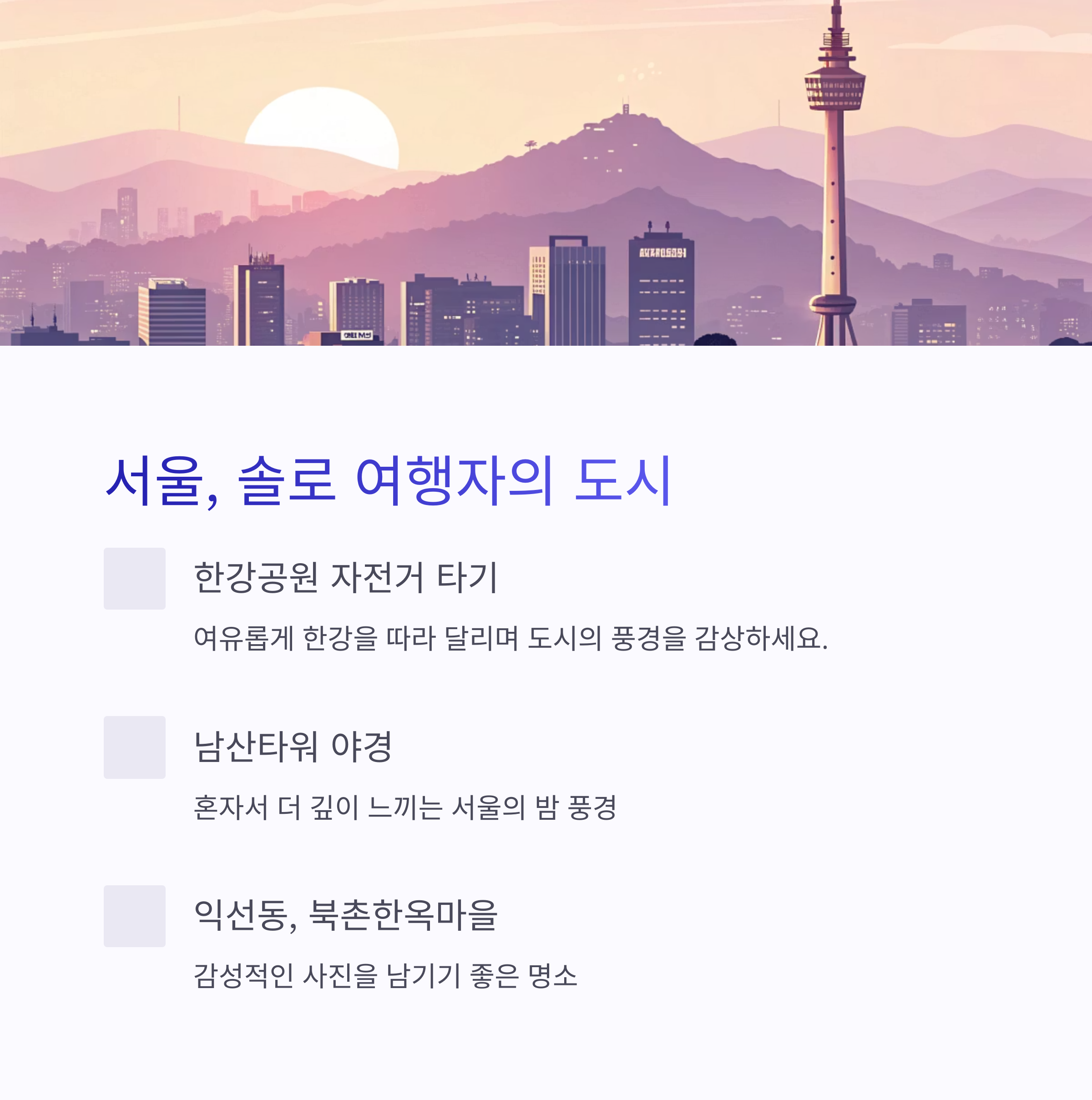 | 혼자 여행 팁 | 준비물부터 코스 계획까지 꼼꼼히 확인 |
