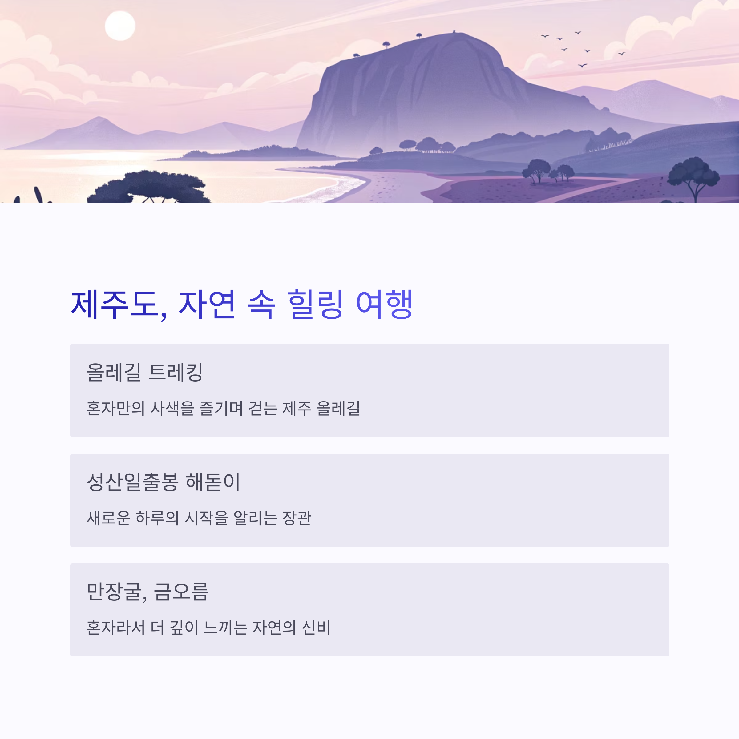 제주도는 자연을 느끼며 조용히 힐링하고 싶은 혼자 여행자에게 딱 맞는 장소입니다. 올레길을 따라 걷는 시간은 자신과의 대화를 가능하게 하고, 성산일출봉에서 맞는 아침은 마음 깊이 감동을 줍니다. 렌터카를 이용하면 접근성이 떨어지는 곳도 부담 없이 다닐 수 있어 추천드리며, 바람을 맞으며 걷는 해안도로와 혼자만의 숙소에서 보내는 시간은 잊지 못할 추억이 될 것입니다.